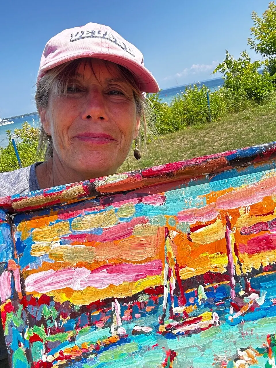 Painting on location moves me to paint with spontaneity. I often explore the landscape’s emotion through animated undertones, symbolic color, or masking in. I intuitively tap my graphic design background to interpret and structure each painting’s composition.