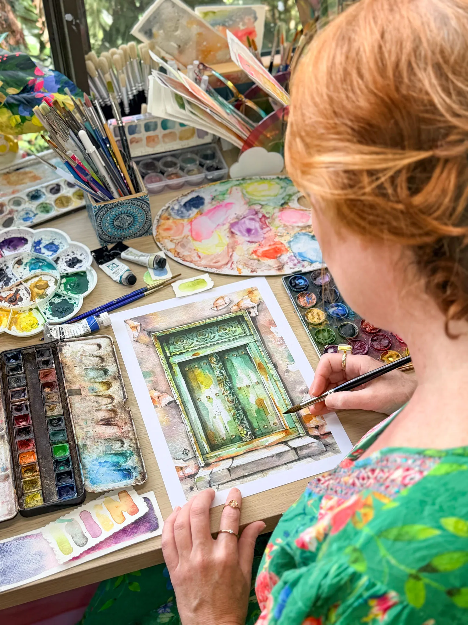 At the start of our adventure, you’ll create your very own handmade travel watercolour sketchbook, crafted from vintage Golden books, and then joyfully fill it with sketches, studies and paintings inspired by souks, doors, deserts, animals, local exotic birds, architecture and magical Moroccan moments. All high-end art materials are provided for the entire week – just bring your curiosity.